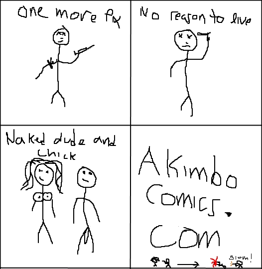 I figured since most webcomics these days contain copious amounts of stick figures, most people will forgive me for this one. I don’t have photoshop, and if I did I would SUCK at it. So here are my Akimbo observations done entirely in paint.net