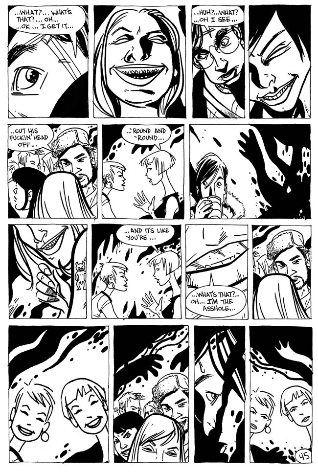 That chick has some nasty teeth. So what’s with the background – at first I thought that it was a first person view, like his eyelids. Are the outlines of his eyelids now clouded by the shadows of worms, or is the background more abstract. Perhaps it’s a representation of the intrusive nature of his paranoia about worms? Maybe it’s a gradual lights out for our confused protagonist. Are those chicks talking about what’s it’s like to be a sac head? Maybe these people were all once sac heads and Sheriff Chuck saved them all. crazy