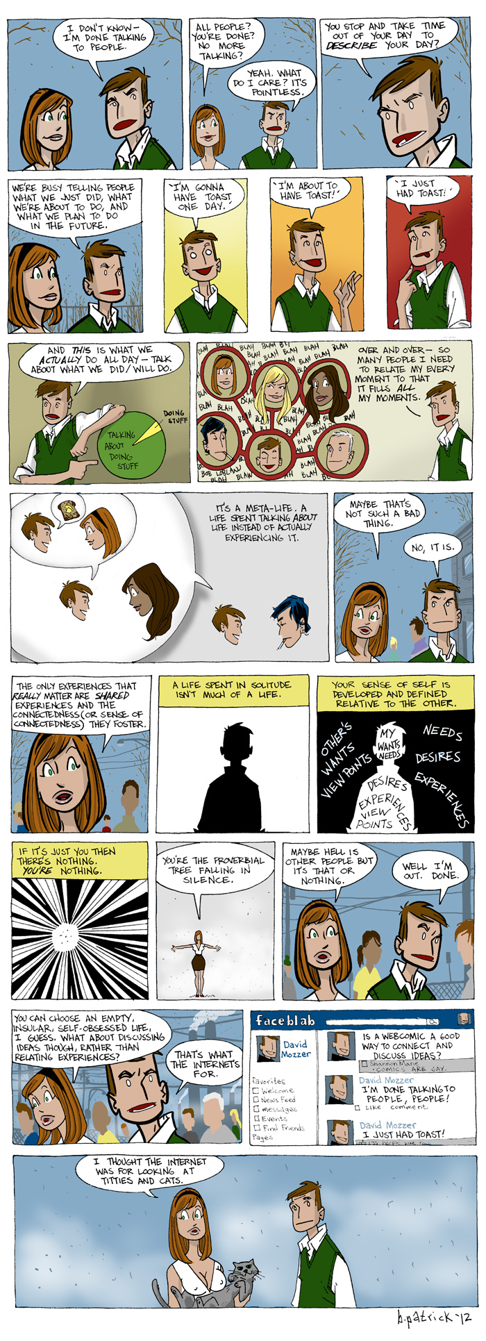 haha in a way i can see where both parties are coming from, but i always believe that a good balance is essential. were human beings, at the end of the day we need isolation just as much as we need interaction. especially love the last 3 panels btw. nice touch on the thought of discussing ideas through the internet, faceblab and the titties 😛