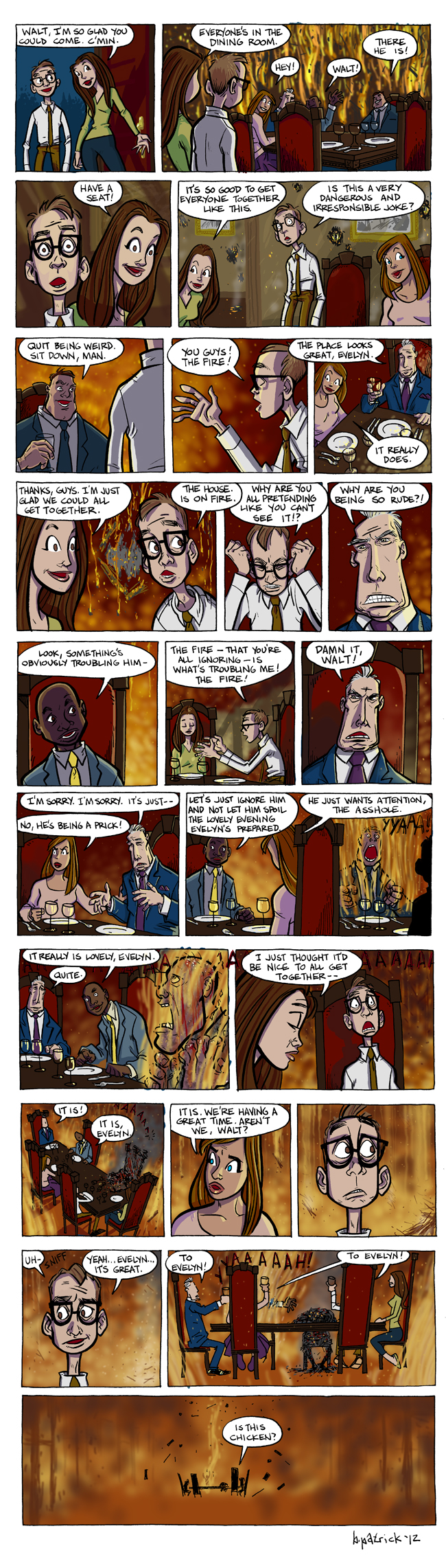 I… think I get it. My guess would be that each other guest went through the same thing. They’d notice the fire, point it out, and basically get shut down. Convinced it was only them, they’d pretend they couldn’t see anything and shut down the next person who “thinks there’s a fire” so that they fit in properly. Similar to that experiment with the monkeys and the ladder with the food and the sprinklers. Anyone who tries to take the side of the guy who’s pointing out the fire is ostracizing themselves from the community and, for this particular scenario, being that jerk that’s ruining the party for everyone. End result: Cozy dinner in a house fire.