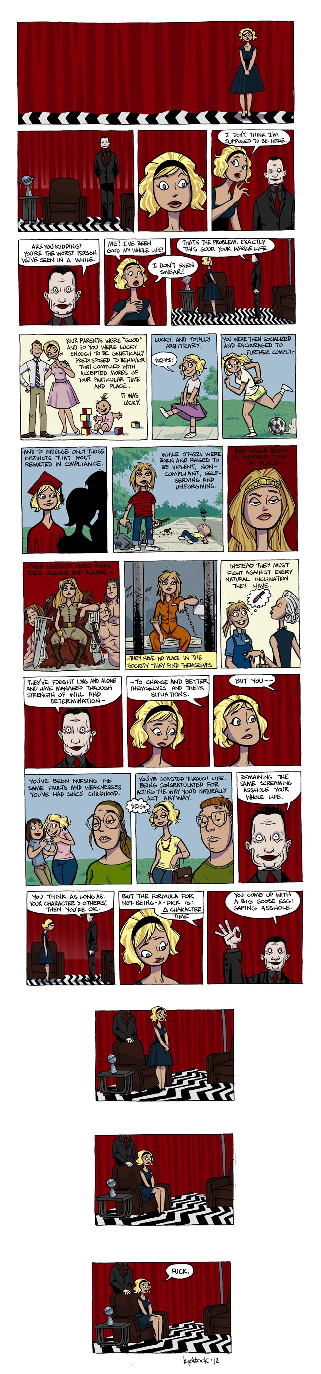 I had been struggling with this one for awhile. I wanted a setting that was not cliche and was drawing a blank. Then I saw a drawing by Scott C. and bam. It’s all about ripping off the right people. By the way, you can add “Black Lodge floor pattern” to things neither fun or satisfying to draw. Also, I’m aware that as I have it stated one can avoid being a dick by having less character than they started out with, but you know what I mean.
