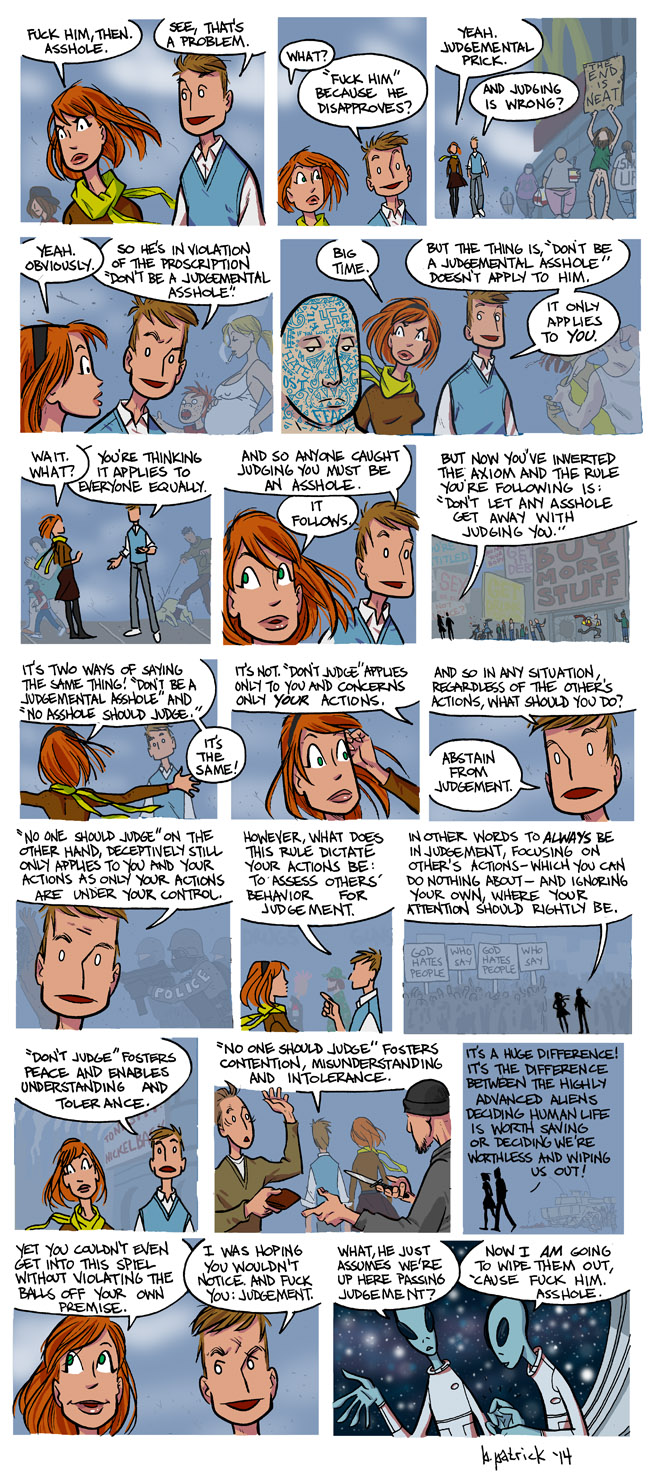 Winston Rowntree’s AMA from a couple years ago brought me here. I’m usually super skeptical about the whole ‘Conversations with the Master” format, because no one has all the answers and it almost always comes off as preachy or condescending (which is why I’ve never been a fan of Plato’s dialogues with Socrates). But, your character making some important point is always someone new, and every comic is one refreshing new thought. And I’m a sucker for a closing panel with aliens in it. Always makes me think of “Silly Asses” by Isaac Asimov.